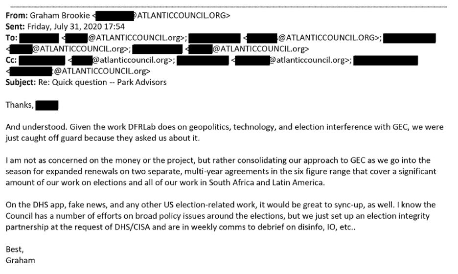 One EIP member stated in a July 2020 email that the EIP was created “at the request of DHS/CISA and are in weekly comms to debrief on disinfo, IO, etc…”