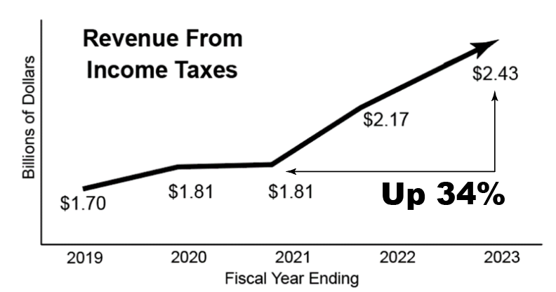The budget that was in effect in 2019 totaled $3.83 billion. Of this, $1.70 billion came from “Individual Income Taxes.” The current state budget collects $5.26 billion in revenue. Of this $2.43 billion comes from income taxes.