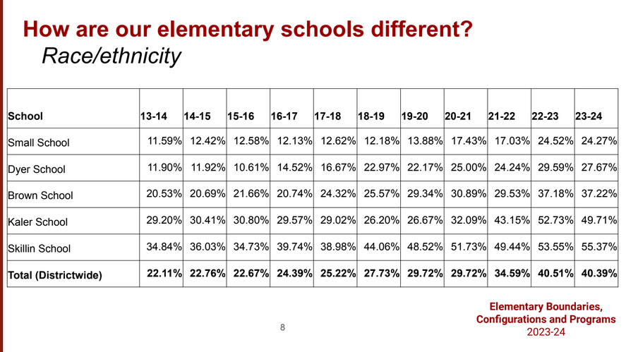 For the 2023-24 academic year, 55.37 percent of students at Skillin School are non-white, compared to just 24.27 percent at Small School, according to data collected by the Committee. Their data also shows that 27.67 percent of Dyer School, 37.22 percent of Brown School, and 49.71 percent of Kaler School are non-white as well.