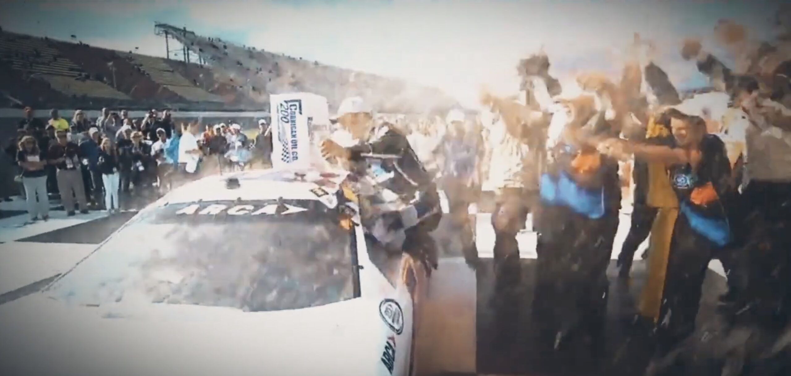 The advertisement incorporates clips from Theriault’s time as a NASCAR driver, including a clip of a first-place finish at Daytona International Speedway.
