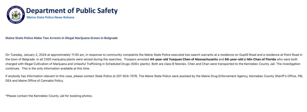 - Raid on Illegal Chinese Marijuana Operation in Western Maine Seizes Illicit Drugs Worth $1M+