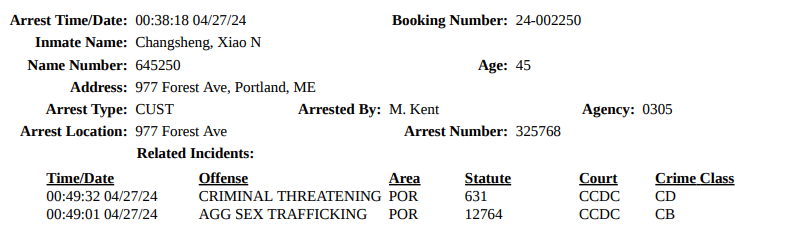 The Cumberland County Sheriff’s Office recorded that the arrest occurred at 977 Forest Ave in Portland, and that Xiao was booked at the Cumberland County Jail shortly before 1 a.m. on Saturday, April 27.