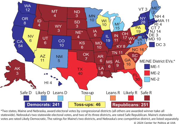 Despite the revisions, Sabato believes that the presidential race as a whole remains a toss-up.