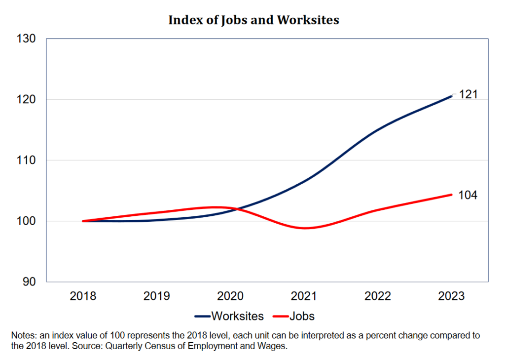 Although jobs were found to be about four percent higher across the board in March of 2023 compared to five years prior, the extent of this increase varies significantly by worksite size.