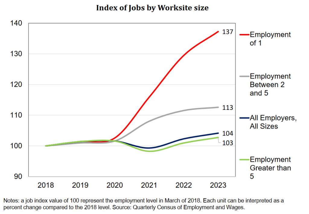 “Much of the net job growth in recent years has been among small worksites with five or fewer employees, many with only one,” said the MDOL.