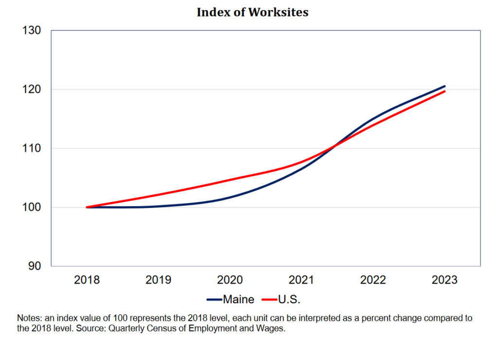 Prior to the COVID-19 pandemic, jobs and worksites typically grew at a similar rate, but the significant increase in those working from home during this time produced a notable spike in Maine worksites that was not evenly mirrored by jobs.