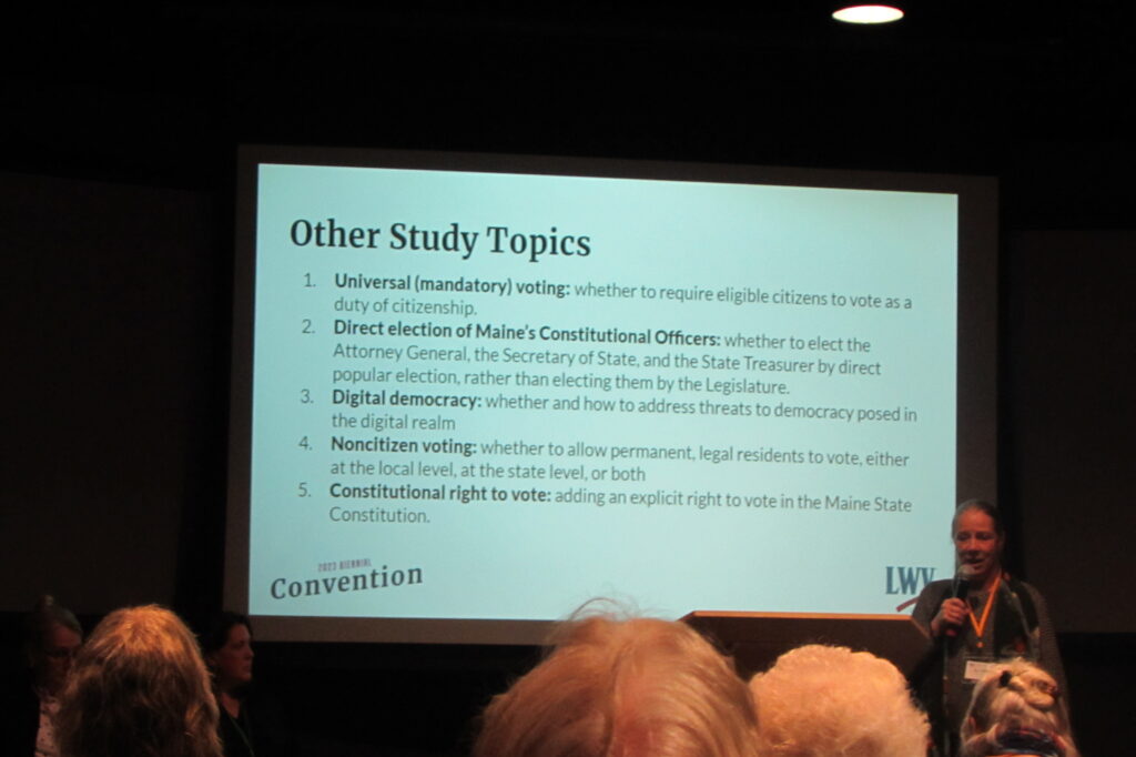 At their June 2023 biennial convention, LWVME presented on a number of potential topics that the organization is seeking to study in the coming years.