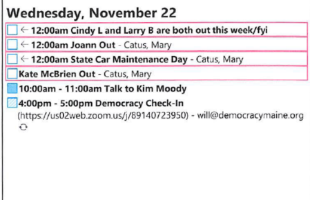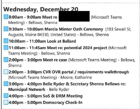 The entry for Bellows’ Nov. 22 meeting shows the email of Democracy Maine and LWVME Advocacy Program Director Will Hayward, the organizations’ chief lobbyist.
