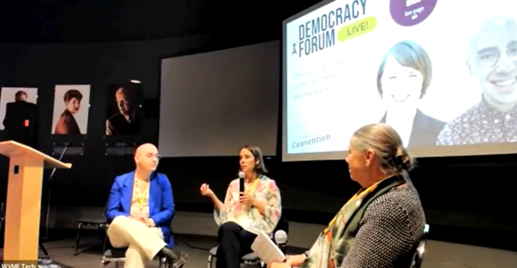 Following Luther’s presentation, Maine Secretary of State Shenna Bellows joined her on stage for a “Democracy Forum” panel discussion, also featuring Stuart Baum, a former research associate the progressive Brennan Center for Justice.