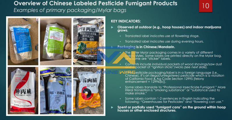 “Since they don’t look like your typical pesticides (and since the packaging is in Chinese), it’s likely other states are unknowingly running into these toxic materials during eradication operations at illicit grows and/or regulatory inspections at licensed cannabis cultivation facilities,” said the presentation’s description.
