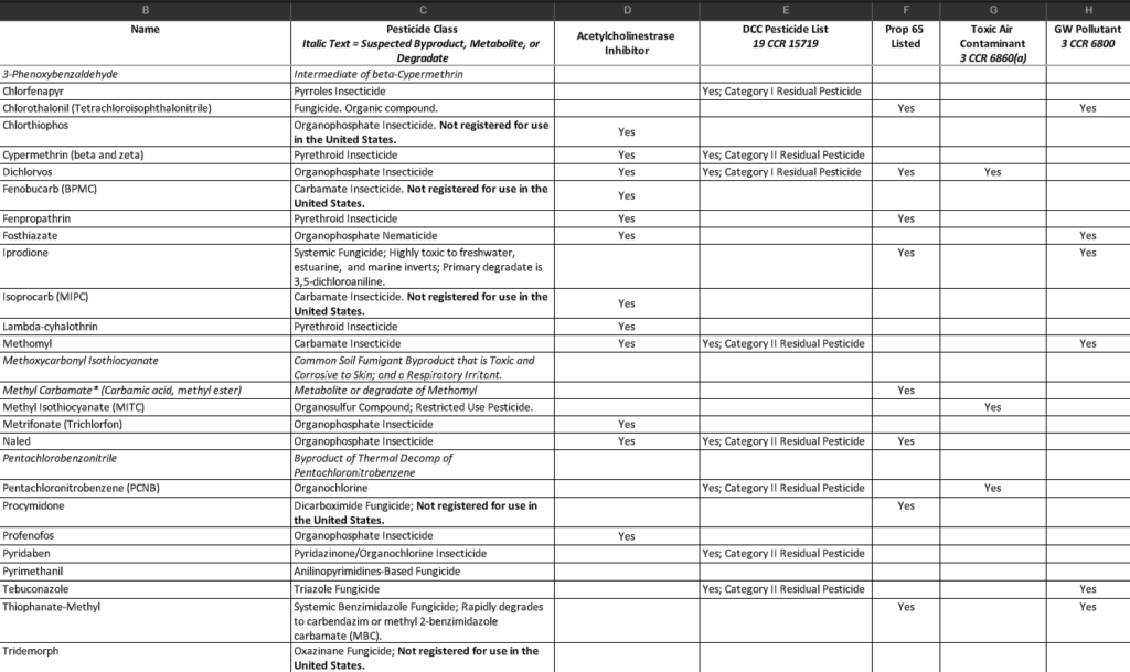 Chemical analysis found that eight of the substances are classified as carcinogens by California, six are groundwater pollutants, three are toxic air contaminants, twelve attack the central nervous system, and five are entirely illegal for use in the U.S.