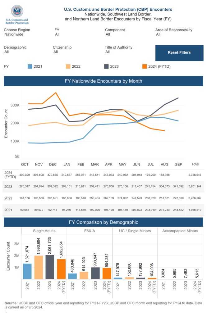 According to the U.S. Department of Homeland Security’s (DHS) data, encounters with illegal border-crossers increased from 1.9 million in 2021 to 3.2 million in 2023.