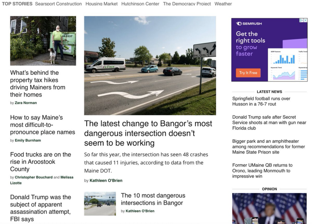 As of Monday morning, the Bangor Daily News and the Portland Press Herald both featured local stories—including a piece about a dangerous intersection in Bangor and an in-depth investigation into the piping plover—while downplaying the attempt by suspected gunman Ryan W. Routh, 58, to gun down Trump at his golf course on Sunday.