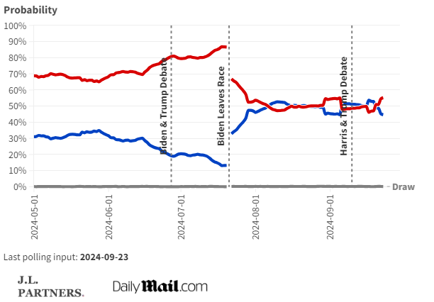 In their model, Harris saw a boost in her electoral chances after her debate with Trump on ABC, which had biased moderators.