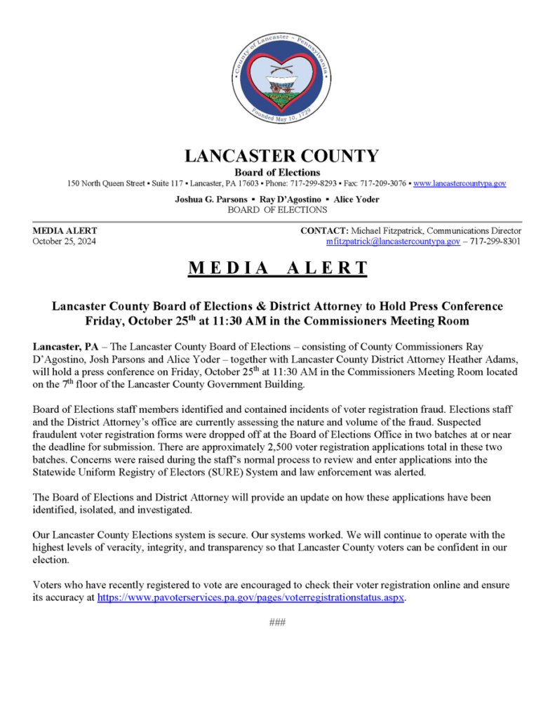 The Lancaster County Board of Elections, which includes County Commissioners Ray D’Agostino, Josh Parsons, and Alice Yoder, addressed the findings in a press conference on Friday morning alongside District Attorney Heather Adams.