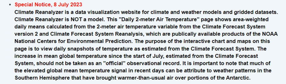 On July 8, 2023, the University of Maineโs Climate Reanalyzer website was updated to include a notice on the global temperature page: