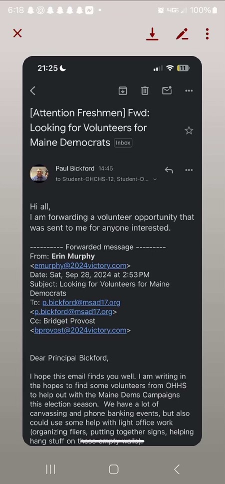 Paul Bickford, Principal at Oxford Hills Comprehensive High School (OHCHS), forwarded a Sept. 28 email from a Maine Democratic Party field organizer to his freshmen students, with the subject line “[Attention Freshmen] FWD: Looking for Volunteers for Maine Democrats.”