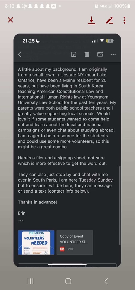 The email in question appears to have been sent to Bickford by Erin Murphy, who according to her LinkedIn page works as a field organizer for the Maine Democratic Party.