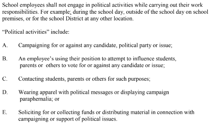 The school district has a policy, code GBIA, which explicitly prohibits school employees from participating in political activities in their role as staff, to include contacting students and parents outside of school to solicit them on behalf of political campaigns.