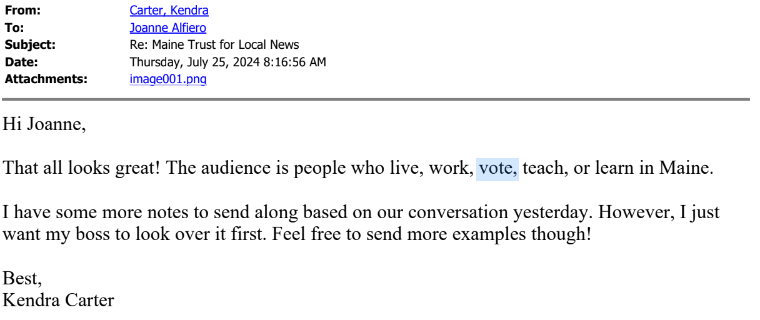 At several points in the email chain, both Maine Trust for Local News staff and Maine DOE staff refer to their work together on the campaign as a “partnership.”