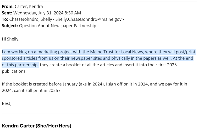 According to the emails, the Maine Trust for Local News will be publishing a 20-page booklet with all six sponsored Maine DOE articles inserted in their outlets’ Thanksgiving issues, to be released during the week of Nov. 24.