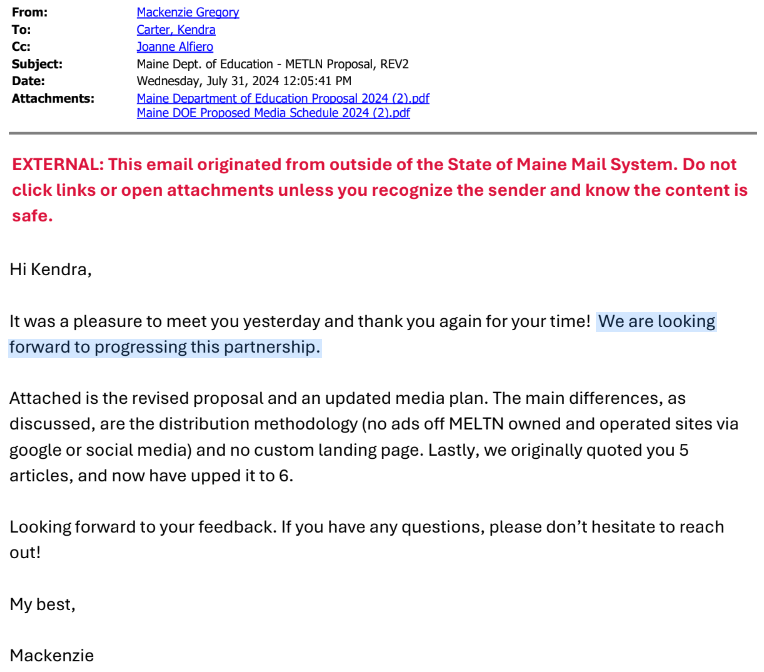 Kendra Carter, Education Marketing Specialist at the Maine DOE, emailed the departments Director of Communications Marcus Mrowka to inform him of the potential campaign on July 24.