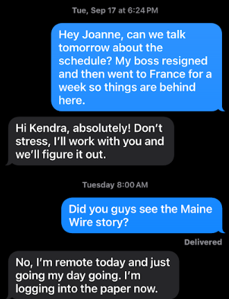 Kendra Carter and Joanne Alfiero also exchanged text messages about the marketing campaign, and at one point even mentioned the Maine Wire’s reporting on their contract.