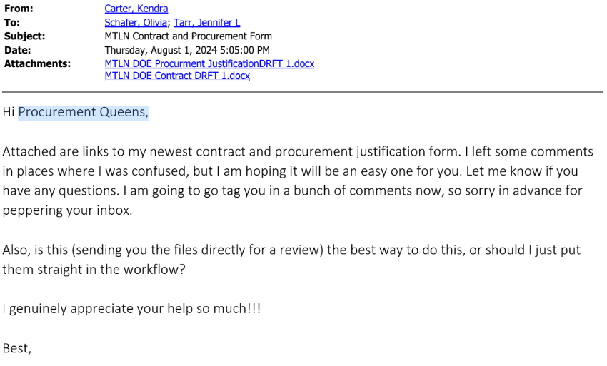 Carter, when emailing two female members of the Maine DOE’s procurement staff in August for assistance on editing contract documents related to the marketing campaign, referred to them as “Procurement Queens.”