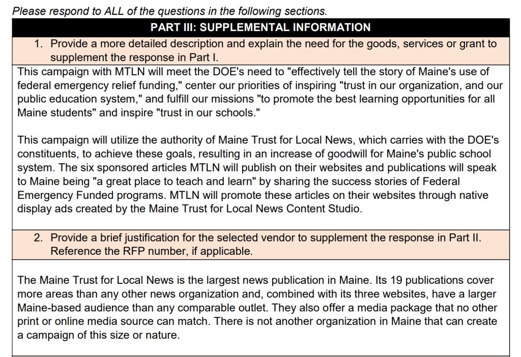 In September, the Maine Wire reported that the Mills administration disclosed a $117,300 no-bid contract with the Maine Trust for Local News, owner of the Portland Press Herald and more than a dozen other news publications across the state, for a marketing campaign with the Maine DOE.