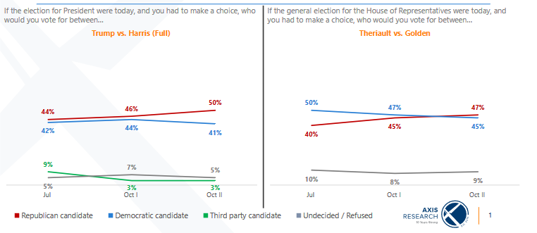 This shift followed a significant change in the percentage of Mainers who are familiar with Rep. Theriault, rising from 39 percent in July to 72 percent in October.
