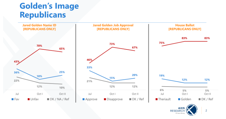 Among Republicans, the share of likely voters with an unfavorable opinion of Golden has skyrocketed since July, increasing 22 percent from 43 percent to 65 percent. Similarly, the percentage of Republicans who disapprove of the job Golden has done in office has jumped from 46 percent to 67 percent.