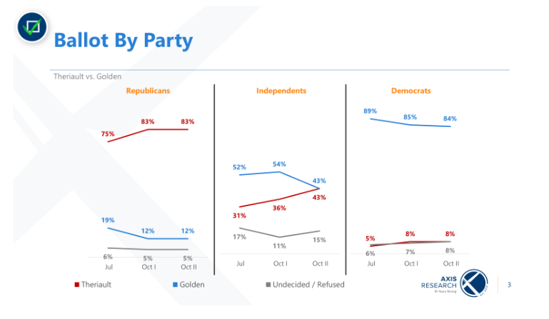 Independents are split evenly between the two candidate with 43 percent intending to support Theriault and 43 planning to back Golden. This is a marked shift from July when 52 percent said they would vote for Golden and just 31 percent were planning to support Theriault.