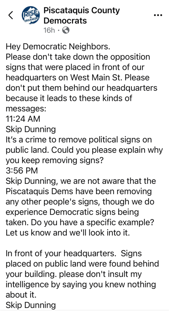 “Hey Democratic Neighbors. Please don’t take down the opposition signs that were placed in front of our headquarters because it leads to these kinds of messages,” said the Piscataquis Democrats.