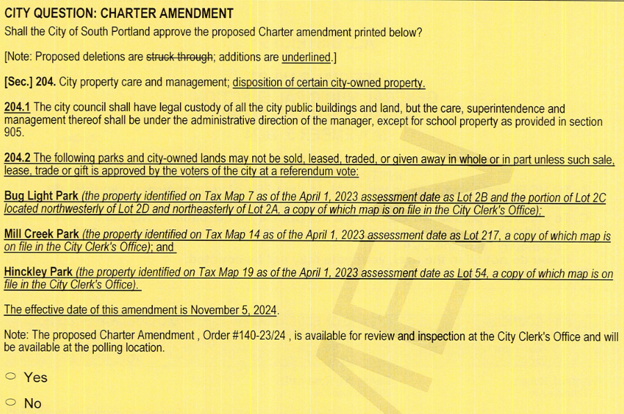 The first question on the ballot asks voters if they would like to require citizen approval for the sale, lease, trade, or gift of three key City-owned properties: Mill Creek Park, Bug Light Park, and Hinkley Park.