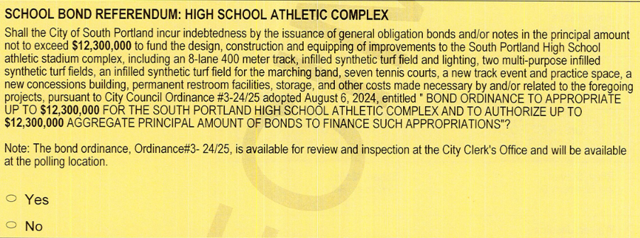 Question 2 represents the largest of these three bonds, seeking approval for $12.3 million in funding for the “design, construction, and equipping of improvements to the South Portland High School athletic stadium complex.”