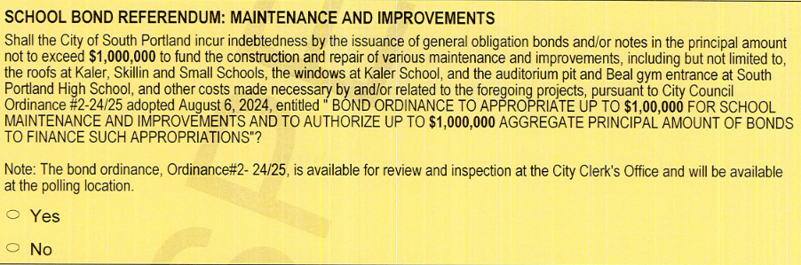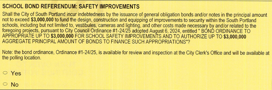 The fourth and final question asks voters to approve a $3 million bond to fund the “design, construction, and equipping of improvements” to public school buildings in South Portland, including vestibules, cameras, and lighting.