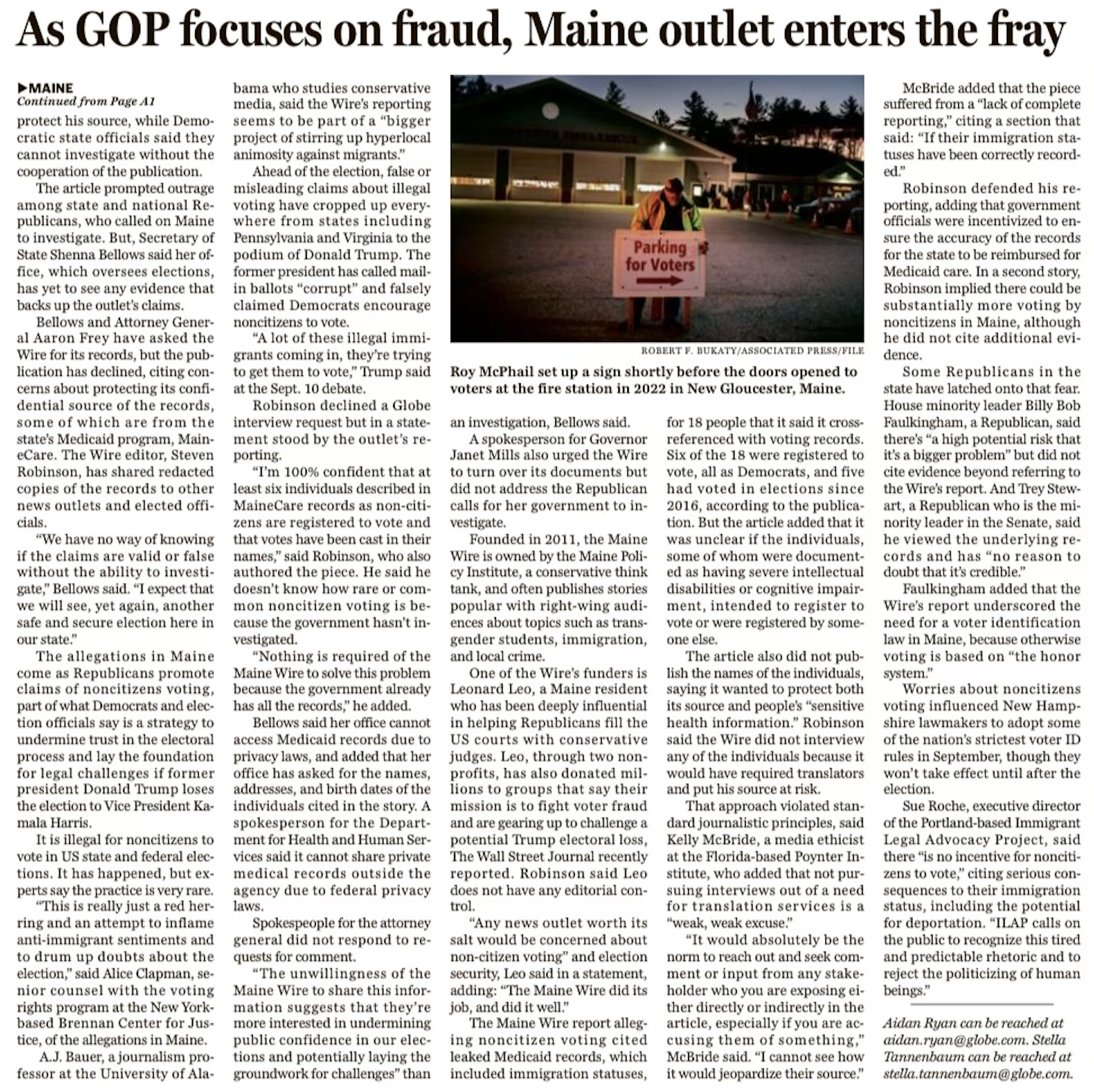 I’m working on a story about the Maine Wire and its report from earlier this month alleging that six non-citizens voted in Maine elections, how the piece has been picked up by the state and national Republican Party, and the request from the Secretary of State’s office to hand over records used in reporting, which I know the Wire has denied.