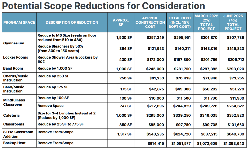 In addition to shrinking the classrooms, Harriman Architects proposed a number of other potential ways to scale back the project, such as making the gym according to middle school regulations, as opposed to high school regulations as was originally planned.