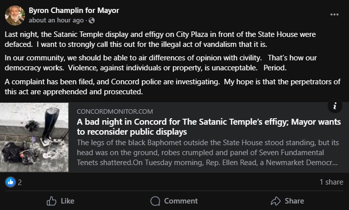 [RELATED: Satanic Temple Puts Up Display Outside NH State House…]