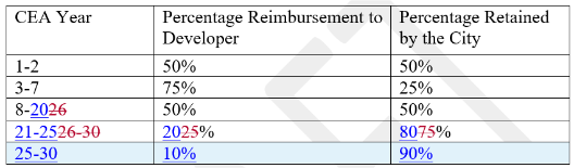 The credit enhancement agreement approved last Tuesday gives the developers a property tax rebate that becomes incrementally smaller over the life of the agreement, starting at 50 percent in the first two years and decreasing to 10 percent in the final five years.