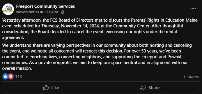 The Maine Wire reached out to the FCS, asking why they decided to cancel the parental rights event, why they initially decided to let the group use their space before canceling, and whether they have canceled other events for similar reasons.