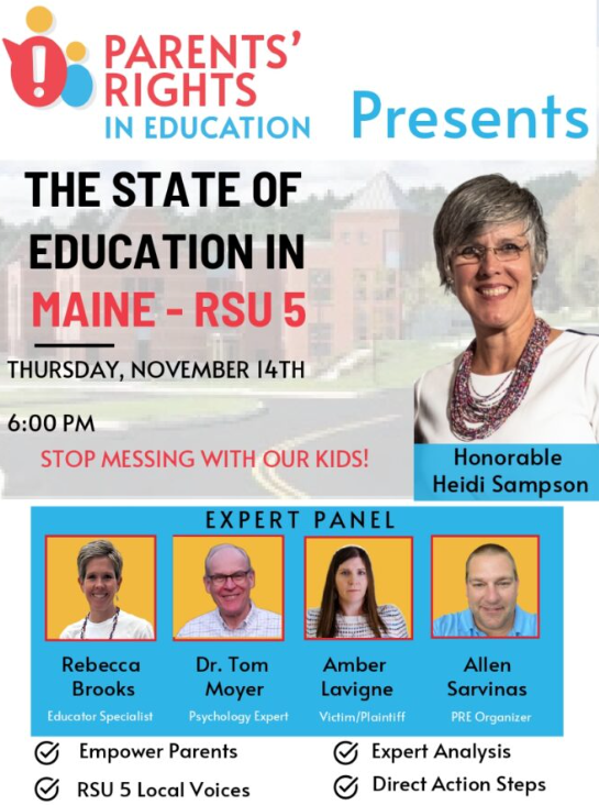 The event, “The State of Education in Maine – RSU5,” promised to include expert analysis, parents from the local school district, and promised to empower parents, using the tagline “stop messing with our kids.”