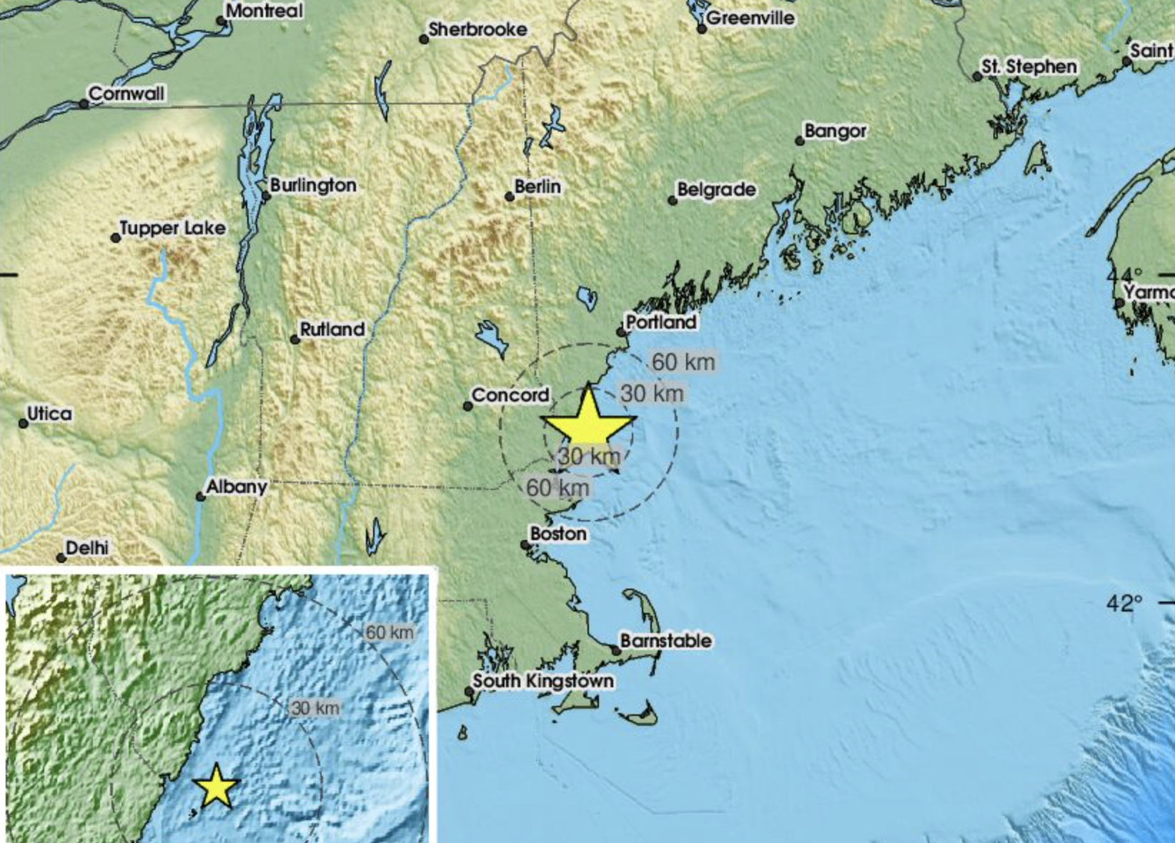 The epicenter was located at a depth of 20 kilometers (12 miles), approximately 19 kilometers (12 miles) east of Portsmouth, New Hampshire, and 75 kilometers (47 miles) east-northeast of Manchester, New Hampshire.
