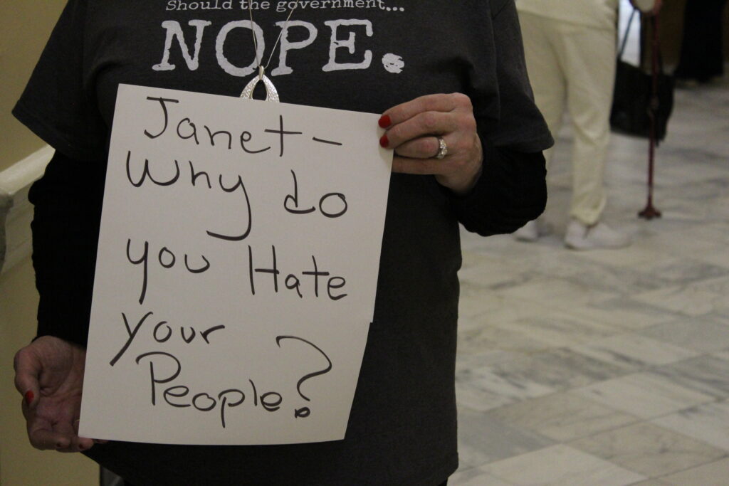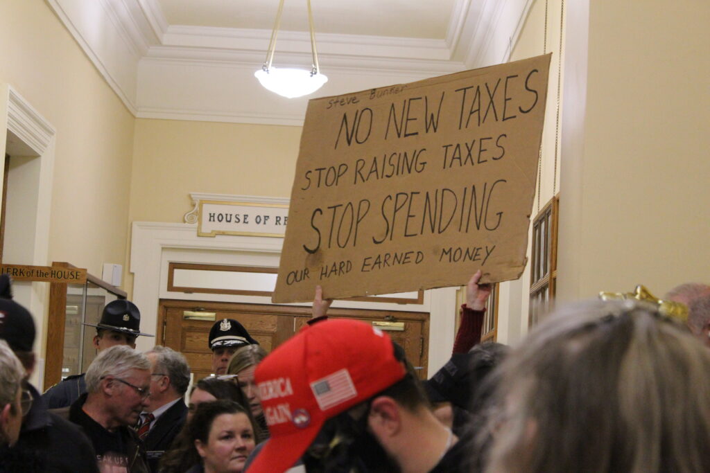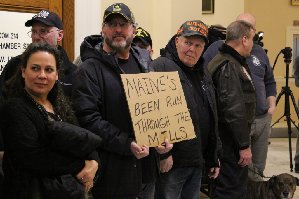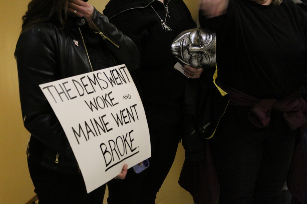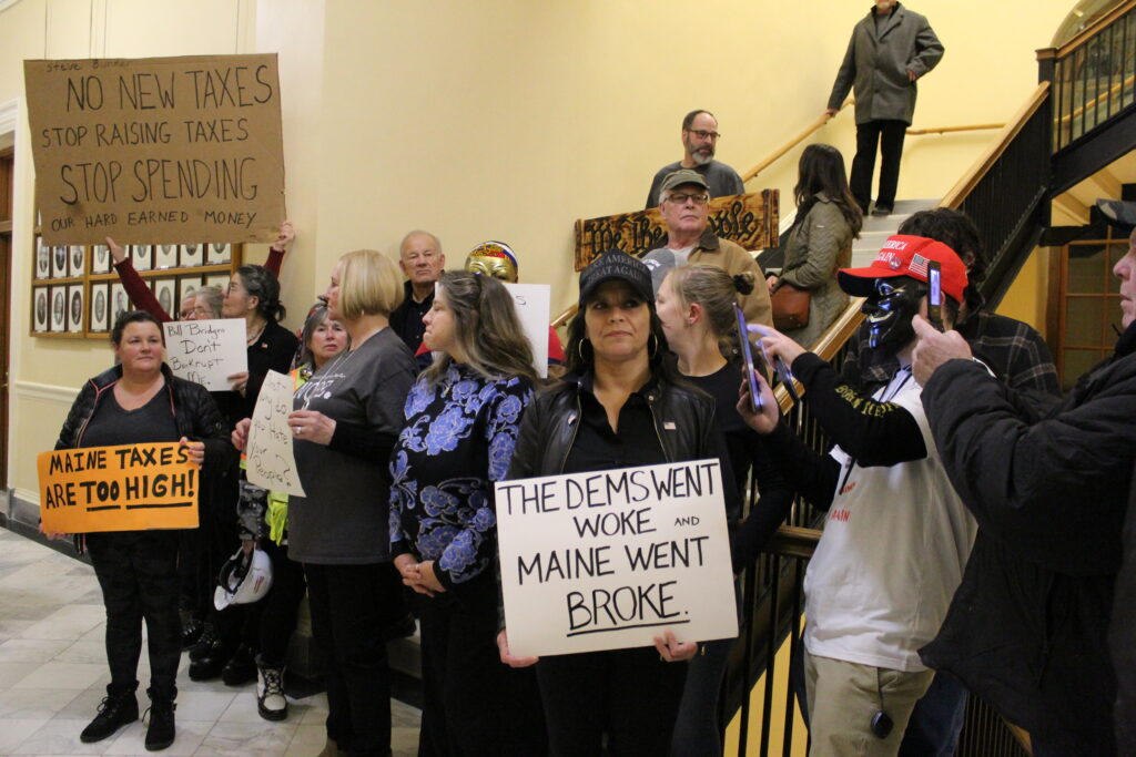 Many of the Mainers who turned out Tuesday night to protest were upset about Mills’ proposed biennial budget, raising concerns over state spending and potential tax hikes.