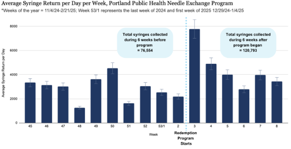 The Portland Public Health director wrote that there has been a 76 percent reduction in the collection of improperly disposed of syringes by city staff from the six weeks before the program (1,677 needles) to the six weeks after (387 needles).