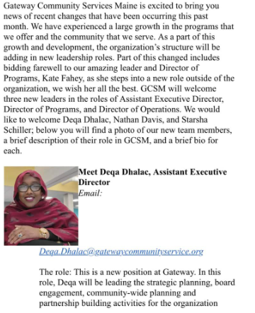 Ekhlas Ahmed, who was recently appointed by Gov. Janet Mills as a policy analyst within the Maine Office of New Americans (ONA), was featured as a community health worker for Gateway Community Services in a 2021 testimonial video published by the nonprofit