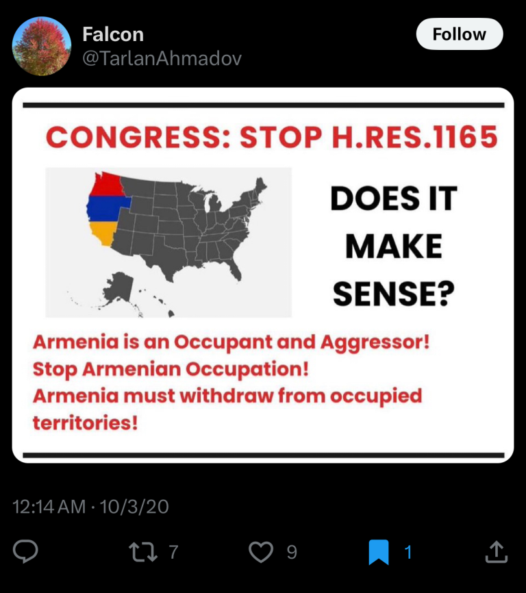 - Social media posts labeling Armenians as “occupants” of the western United States due to the large population of Armenian-Americans in California and the Pacific North West