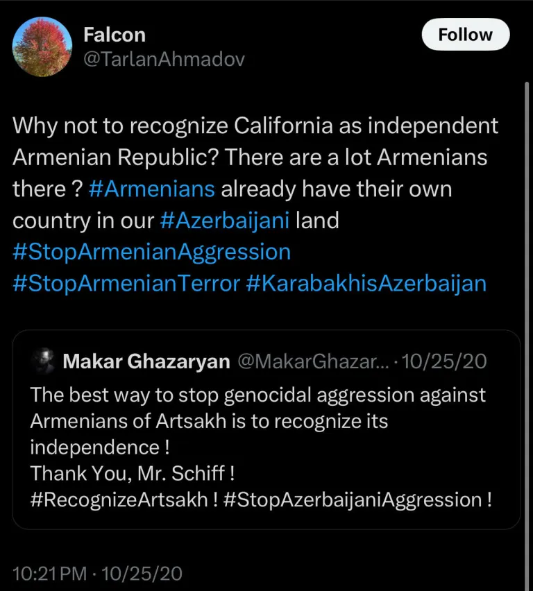- Posts praising military crackdowns in Nagorno-Karabakh and caricaturing famed Armenian Kim Kardashian as a horned devil