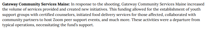 According to a fact sheet published by MaineCF, Gateway Community Services utilized the funds to establish “youth support groups with certified counselors,” as well as to initiate “food delivery services for those affected,” and to host “peer support events” on Zoom.