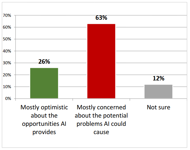 53 percent of respondents said they follow the discussions surrounding AI to some extent. 63 percent, however, are concerned about the potential problems that AI may cause in society, while just 26 percent are optimistic about the impact that it may have.